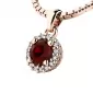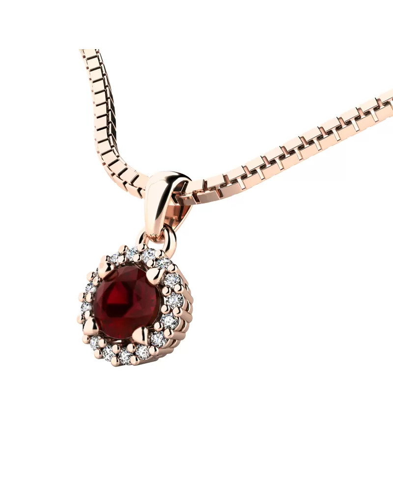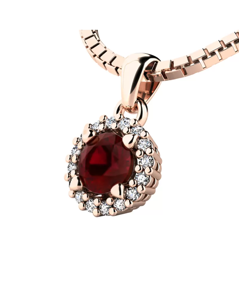 Nádherný přívěsek zdobený větším středovým granátem a menšími diamanty určitě potěší každou ženu. Přívěsek je vyrobený z růžového čtrnáctikarátového zlata - 585/1000 v lesklé povrchové úpravě. Vsazené diamanty jsou vybroušeny dokonalým briliantovým brusem, díky kterému dokonale odráží světlo a jejich brilance neuvěřitelné září z každého úhlu pohledu! Všechny diamanty jsou pevně uchyceny krapnami. Vsazování diamantů provádějí naši nejzkušenější mistři zlatníci ručně pod mikroskopem s přesností na 0,01mm a proto nehrozí vypadnutí kamínků jako to bývá u strojně vyráběných náušnic. Celé náušnice působí dokonalým a luxusním dojmem!