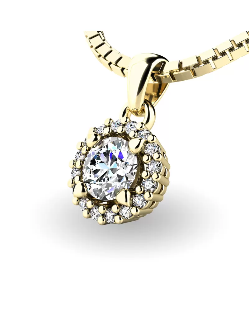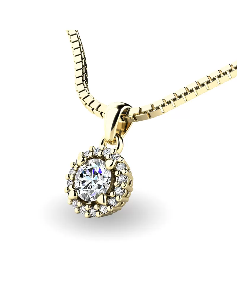 Nádherný prívesok zdobený väčším stredovým diamantom a menšími diamantmi určite poteší každú ženu. Prívesok je vyrobený zo žltého štrnásťkarátového zlata - 585/1000 v lesklej povrchovej úprave. Vsadené diamanty sú vybrúsené dokonalým briliantovým brusom, vďaka ktorému dokonale odráža svetlo a ich brilancia neuveriteľné žiari z každého uhla pohľadu! Všetky diamanty sú pevne uchytené krapnami. Vsadzovanie diamantov vykonávajú naši najskúsenejší majstri zlatníci ručne pod mikroskopom s presnosťou na 0,01 mm a preto nehrozí vypadnutie kamienkov ako to býva u strojne vyrábaných náušníc. Celé náušnice pôsobia dokonalým a luxusným dojmom!