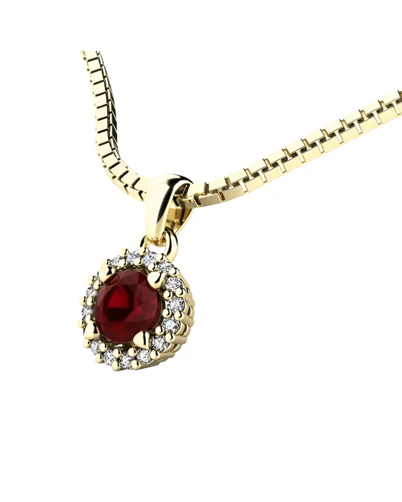 Nádherný přívěsek zdobený větším středovým granátem a menšími diamanty určitě potěší každou ženu. Přívěsek je vyrobený ze žlutého čtrnáctikarátového zlata - 585/1000 v lesklé povrchové úpravě. Vsazené diamanty jsou vybroušeny dokonalým briliantovým brusem, díky kterému dokonale odráží světlo a jejich brilance neuvěřitelné září z každého úhlu pohledu! Všechny diamanty jsou pevně uchyceny krapnami. Vsazování diamantů provádějí naši nejzkušenější mistři zlatníci ručně pod mikroskopem s přesností na 0,01mm a proto nehrozí vypadnutí kamínků jako to bývá u strojně vyráběných náušnic. Celé náušnice působí dokonalým a luxusním dojmem!