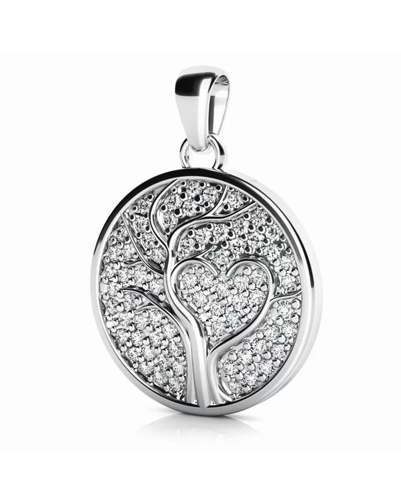 Briliantový šperk neodmietne žiadna žena. Medailón so stromom života je vyrobený z bieleho štrnásťkarátového zlata - 585/1000 v lesklej povrchovej úprave. V čelnej strane je vsadených šesťdesiat okrúhlych diamantov briliantového brusu, ktorý zaisťuje maximálnu brilanciu vybrúsených facet, dokonale odráža svetlo a neuveriteľné žiari z každého uhla pohľadu! Vsadzovanie diamantov vykonávajú naši najskúsenejší majstri zlatníci ručne pod mikroskopom s presnosťou na 0,01mm a preto nehrozí vypadnutie kamienkov ako to býva u strojne vyrábaných príveskov. Krásnym prvkom tohto prívesku je vystupujúci reliéf stromu života so srdcom z plochy vysadenej diamantmi. Celý prívesok pôsobí dokonalým a luxusným dojmom!
