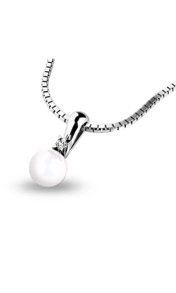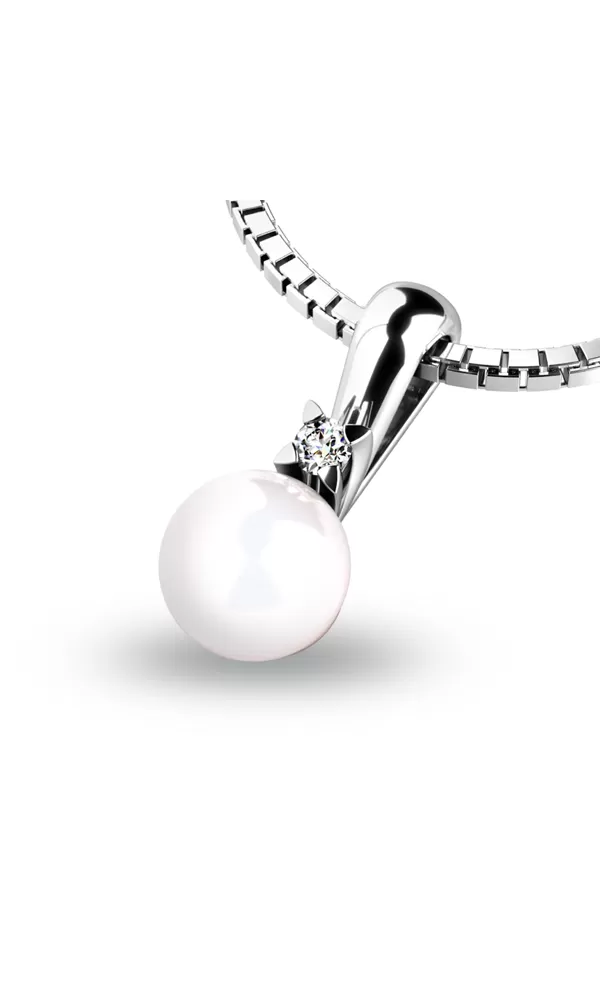 Prívesok je vyrobený z bieleho štrnásťkarátového zlata - 585/1000 v lesklej povrchovej úprave a zdobí ho sladkovodná perla a diamant. Diamant je vybrúsený briliantovým brusom, ktorý zaisťuje maximálnu brilanciu vybrúsených facet, dokonale odráža svetlo a neuveriteľne žiari z každého uhla pohľadu! Vsadzovanie diamantov vykonávajú naši najskúsenejší majstri zlatníci ručne pod mikroskopom s presnosťou na 0,01 mm a preto nehrozí vypadnutie kamienkov ako to býva u strojne vyrábaných náušníc.