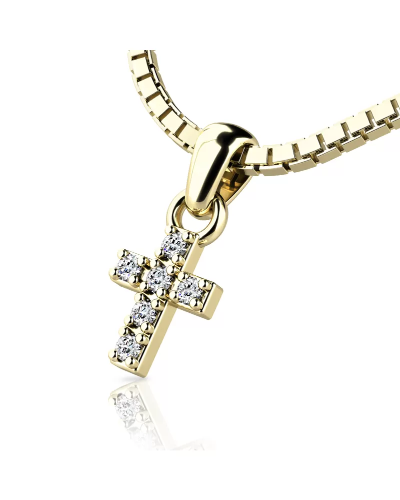 Prívesok v tvare krížika je v celej ploche posádzaný diamantmi a je vyrobený zo žltého štrnásťkarátového zlata - 585/1000 v lesklej povrchovej úprave. V krížiku je vsadených 6 ks okrúhlych diamantov briliantového brusu, ktorý zaisťuje maximálnu brilanciu vybrúsených facet, dokonale odráža svetlo a neuveriteľné žiari z každého uhla pohľadu! Vsadzovanie diamantov vykonávajú naši najskúsenejší majstri zlatníci ručne pod mikroskopom s presnosťou na 0,01mm a preto nehrozí vypadnutie kamienkov ako to býva u strojne vyrábaných príveskov.