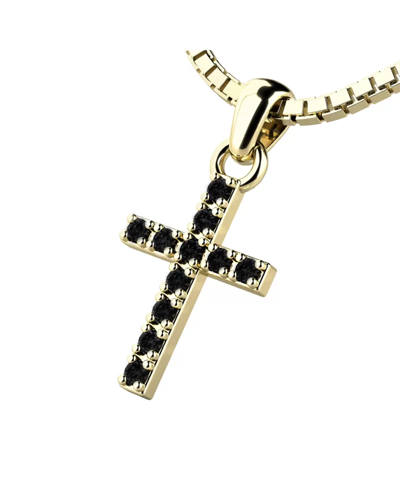 Prívesok v tvare krížika je v celej ploche posádzaný čiernymi diamantmi a je vyrobený zo žltého štrnásťkarátového zlata - 585/1000 v lesklej povrchovej úprave. V krížiku je vsadených 11 ks okrúhlych diamantov čiernej farby a briliantového brusu. Vsadzovanie diamantov vykonávajú naši najskúsenejší majstri zlatníci ručne pod mikroskopom s presnosťou na 0,01mm a preto nehrozí vypadnutie kamienkov ako to býva u strojne vyrábaných príveskov.