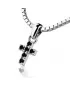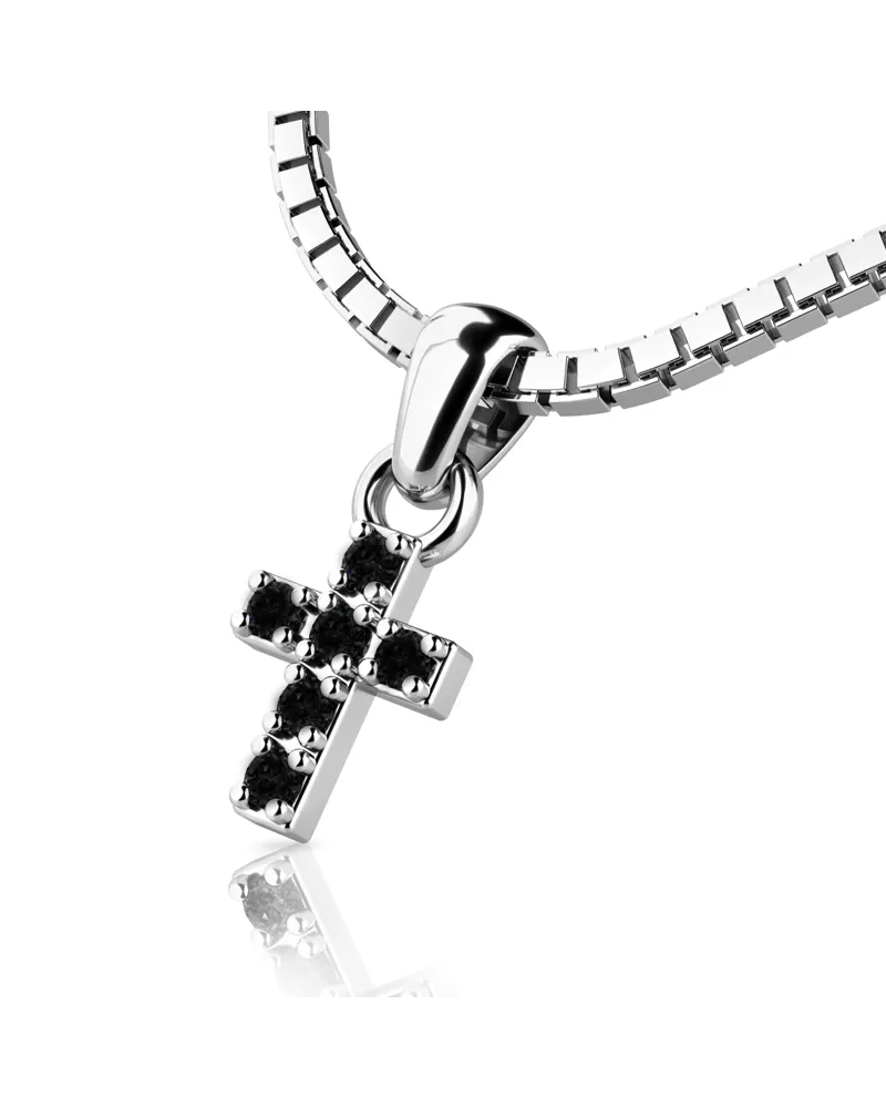 Prívesok v tvare krížika je v celej ploche posádzaný čiernymi diamantmi a je vyrobený z bieleho štrnásťkarátového zlata - 585/1000 v lesklej povrchovej úprave. V krížiku je vsadených 6 ks okrúhlych čiernych diamantov briliantového brusu. Vsadzovanie diamantov vykonávajú naši najskúsenejší majstri zlatníci ručne pod mikroskopom s presnosťou na 0,01mm a preto nehrozí vypadnutie kamienkov ako to býva u strojne vyrábaných príveskov.