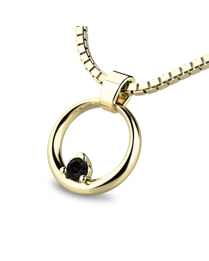 Prívesok v tvare krúžku je vyrobený zo žltého štrnásťkarátového zlata - 585/1000 v lesklej povrchovej úprave s jedným okrúhlym čiernym diamantom… Celý popis