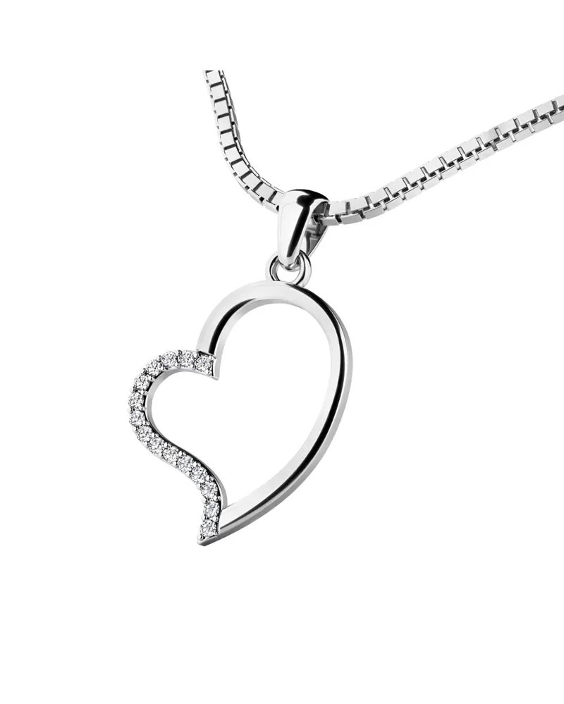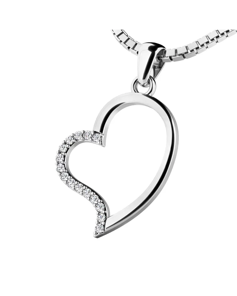 Chcete zapôsobiť na vašu druhú polovičku? Obdarujte ju príveskom v tvare srdca. Tento nádherný, žiarivý prívesok je vyrobený z bieleho štrnásťkarátového zlata - 585/1000 v lesklej povrchovej úprave. Do kontúry srdiečka je vsadených pätnásť diamantov s briliantovým výbrusom, ktorý dáva diamantom maximálny lesk a brilanciu z každého uhla! Skvele odráža svetlo a september!