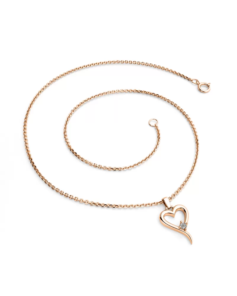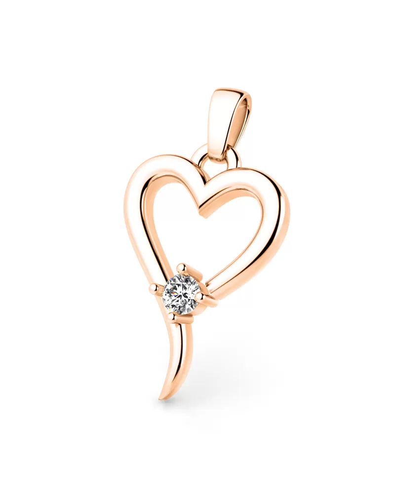 Pre ženy, ktoré majú radi slušné luxusné šperky, máme jeden prívesok s jemným srdcom zdobeným diamantom. V srdci je nastavený jeden okrúhly diamant brilantného brúsenia a pevne pripevnený štyrmi pražičkami. Brilantná Skore mu dáva dokonalú brilanciu, skvelá odráža svetlo a svieti zo všetkých pohľadov! Diamantové nastavenie vykonávajú naši najskúsenejší majstri ručne ručne pod mikroskopom s presnosťou 0,01 mm, a preto neexistuje riziko, že kamene padajú ako náušnice vyrobené v stroji.  Tento krásny, žiarivý prívesok je vyrobený z ružového štrnástich zlatých - 585/1000 v lesklom povrchu.