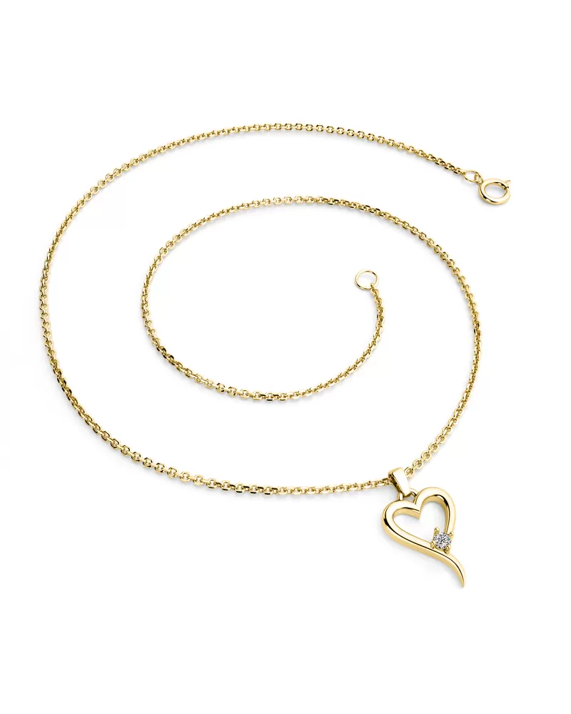 Pre ženy, ktoré majú radi slušné luxusné šperky, máme jeden prívesok s jemným srdcom zdobeným diamantom. V srdci je nastavený jeden okrúhly diamant brilantného brúsenia a pevne pripevnený štyrmi pražičkami. Brilantná Skore mu dáva dokonalú brilanciu, skvelá odráža svetlo a svieti zo všetkých pohľadov! Diamantové nastavenie vykonávajú naši najskúsenejší majstri ručne ručne pod mikroskopom s presnosťou 0,01 mm, a preto neexistuje riziko, že kamene padajú ako náušnice vyrobené v stroji.  Tento krásny, žiarivý prívesok je vyrobený zo žltých štrnástich zlatých - 585/1000 v lesklom povrchu.