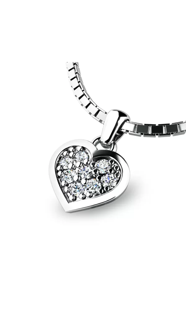 Chcete zapôsobiť na vašu druhú polovičku? Rozžiarte jej dekolt briliantmi a najlepšie príveskom v tvare srdca. Tento nádherný, žiarivý prívesok je vyrobený z bieleho štrnásťkarátového zlata - 585/1000 v lesklej povrchovej úprave. Povrch srdiečka je mierne bombírovaný - prehnutý a je doň vsadených osem diamantov s briliantovým výbrusom, ktorý dáva diamantom maximálny lesk a brilanciu z každého uhla! Práca našich zlatníkov je taká mimoriadna, že môžete vidieť dokonalé usadenie každého diamantu.