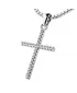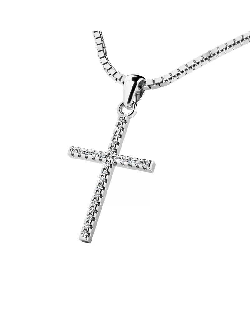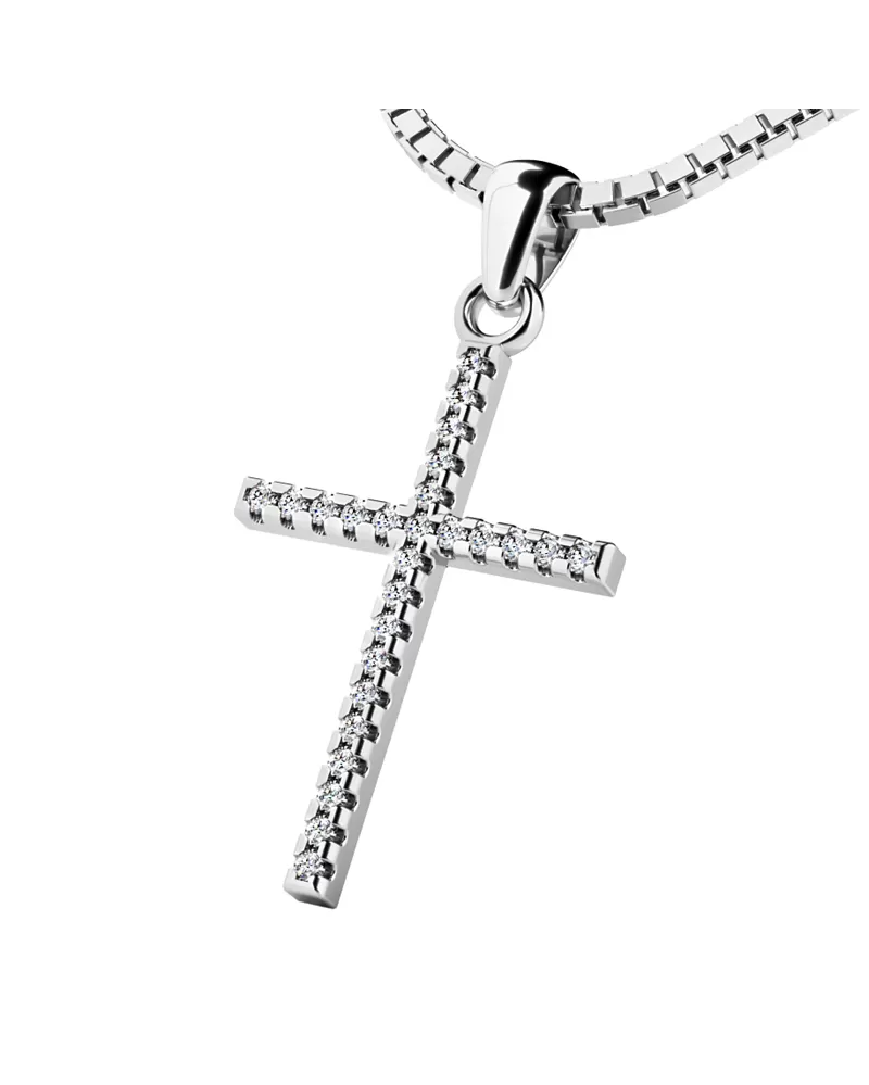 Veľmi obľúbený prívesok v tvare kríža, pôsobí veľmi luxusne a decentne. Prívesok je vyrobený z bieleho štrnásťkarátového zlata - 585/1000 v lesklej povrchovej úprave. V krížiku je vsadených dvadsaťšesť okrúhlych diamantov briliantového brusu, ktorý zaisťuje diamantom maximálnu brilanciu zo všetkých uhlov pohľadu. Vsadzovanie diamantov vykonávajú naši najskúsenejší majstri zlatníci ručne pod mikroskopom s presnosťou na 0,01mm a preto nehrozí vypadnutie kamienkov ako to býva u strojne vyrábaných príveskov.