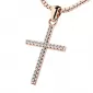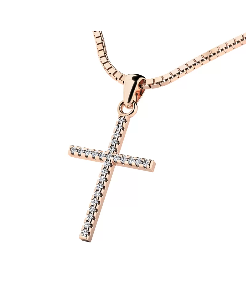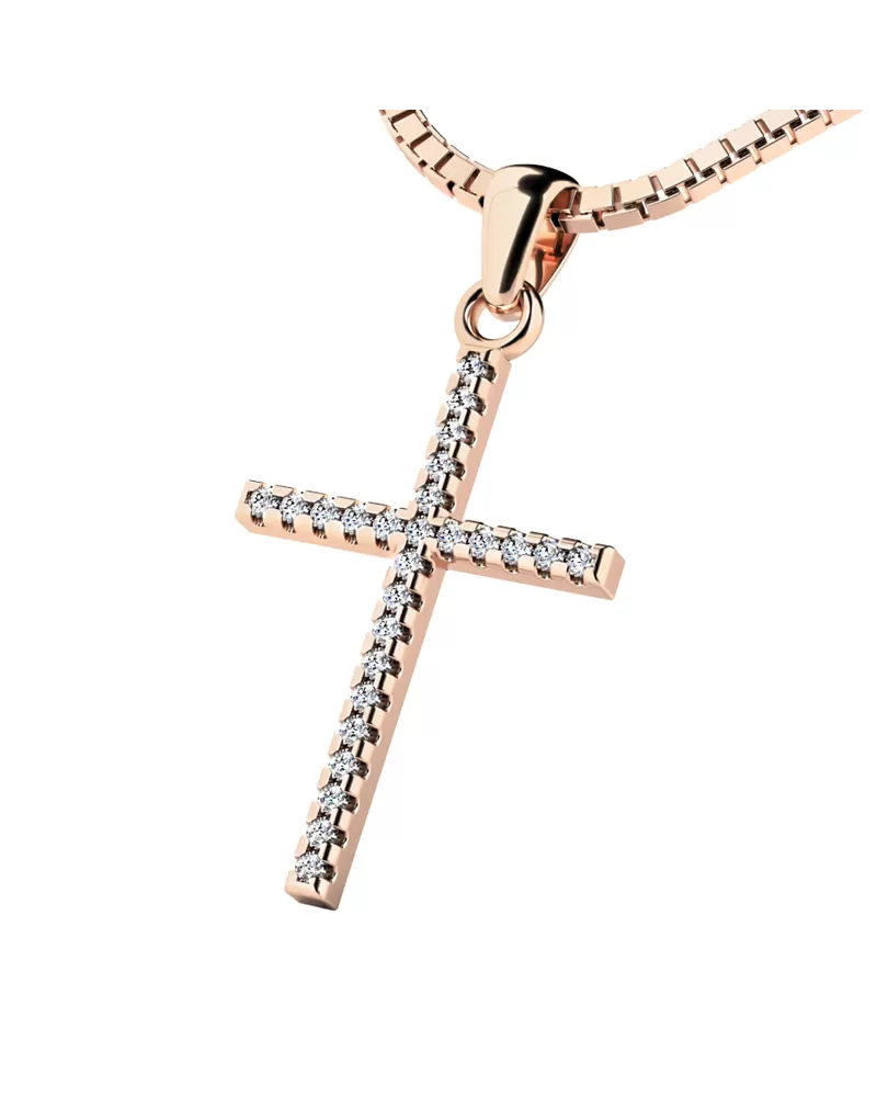 Veľmi obľúbený prívesok v tvare kríža, pôsobí veľmi luxusne a decentne. Prívesok je vyrobený z ružového štrnásťkarátového zlata - 585/1000 v lesklej povrchovej úprave. V krížiku je vsadených dvadsaťšesť okrúhlych diamantov briliantového brusu, ktorý zaisťuje diamantom maximálnu brilanciu zo všetkých uhlov pohľadu. Vsadzovanie diamantov vykonávajú naši najskúsenejší majstri zlatníci ručne pod mikroskopom s presnosťou na 0,01mm a preto nehrozí vypadnutie kamienkov ako to býva u strojne vyrábaných príveskov.