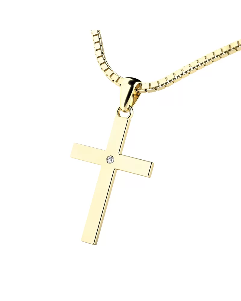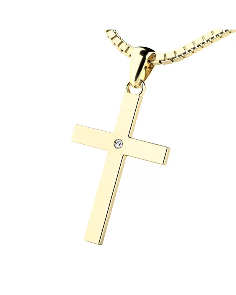 Veľmi obľúbený prívesok v tvare kríža, pôsobí veľmi luxusne a decentne. Prívesok je vyrobený zo žltého štrnásťkarátového zlata - 585/1000 v lesklej povrchovej úprave. V krížiku je vsadený jeden okrúhly diamant briliantového brusu, ktorý zaisťuje diamantu maximálnu brilanciu zo všetkých uhlov pohľadu. Vsadzovanie diamantov vykonávajú naši najskúsenejší majstri zlatníci ručne pod mikroskopom s presnosťou na 0,01mm a preto nehrozí vypadnutie kamienkov ako to býva u strojne vyrábaných príveskov.