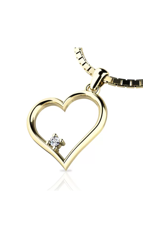 Pre ženy čo obľubujú decentné luxusné šperky tu máme jeden jemný prívesok v tvare srdca zdobený diamantom. V srdiečku je vsadený jeden okrúhly diamant briliantového brusu a pevne uchytený štyrmi krapnami. Briliantový brús im dodáva dokonalú brilanciu, skvele odráža svetlo a žiari z každého uhla pohľadu! Vsadzovanie diamantov vykonávajú naši najskúsenejší majstri zlatníci ručne pod mikroskopom s presnosťou na 0,01 mm a preto nehrozí vypadnutie kamienkov ako to býva u strojne vyrábaných náušníc.  Tento nádherný, žiarivý prívesok je vyrobený zo žltého štrnásťkarátového zlata - 585/1000 v lesklej povrchovej úprave.