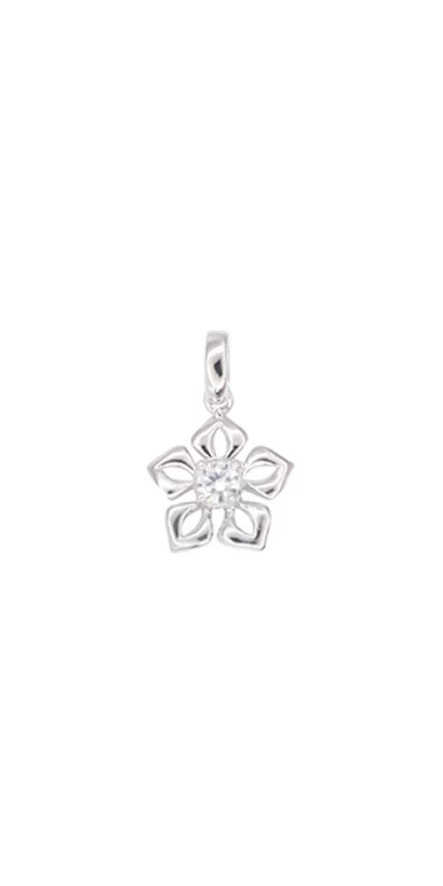 Romantický dámsky prívesok v tvare kvietky je vyrobený z bieleho štrnásťkarátového zlata - 585/1000 v lesklej povrchovej úprave a zdobený je jedným diamantom briliantového brusu uprostred kvietky.