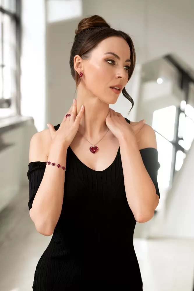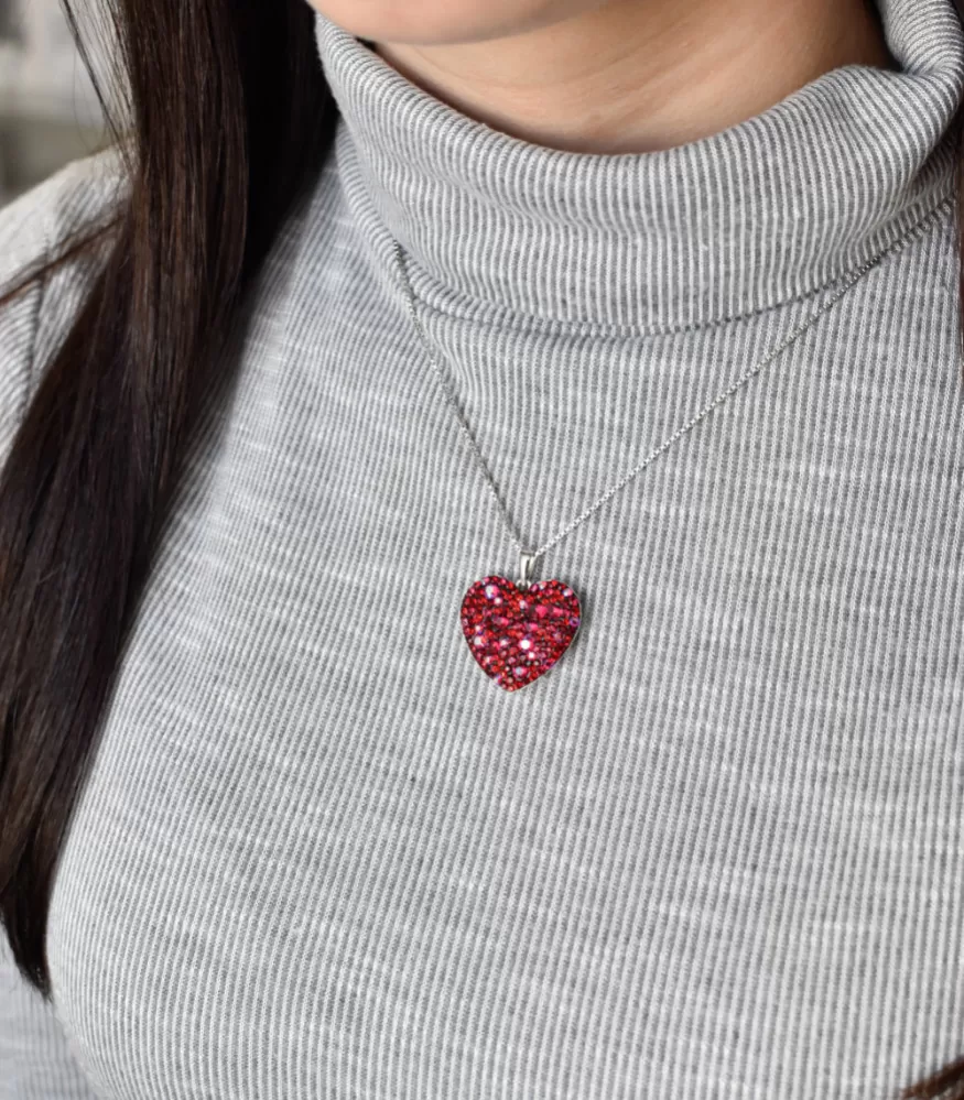 Srdiečko je vysadené Swarovski kryštálmi v červenej farbe.