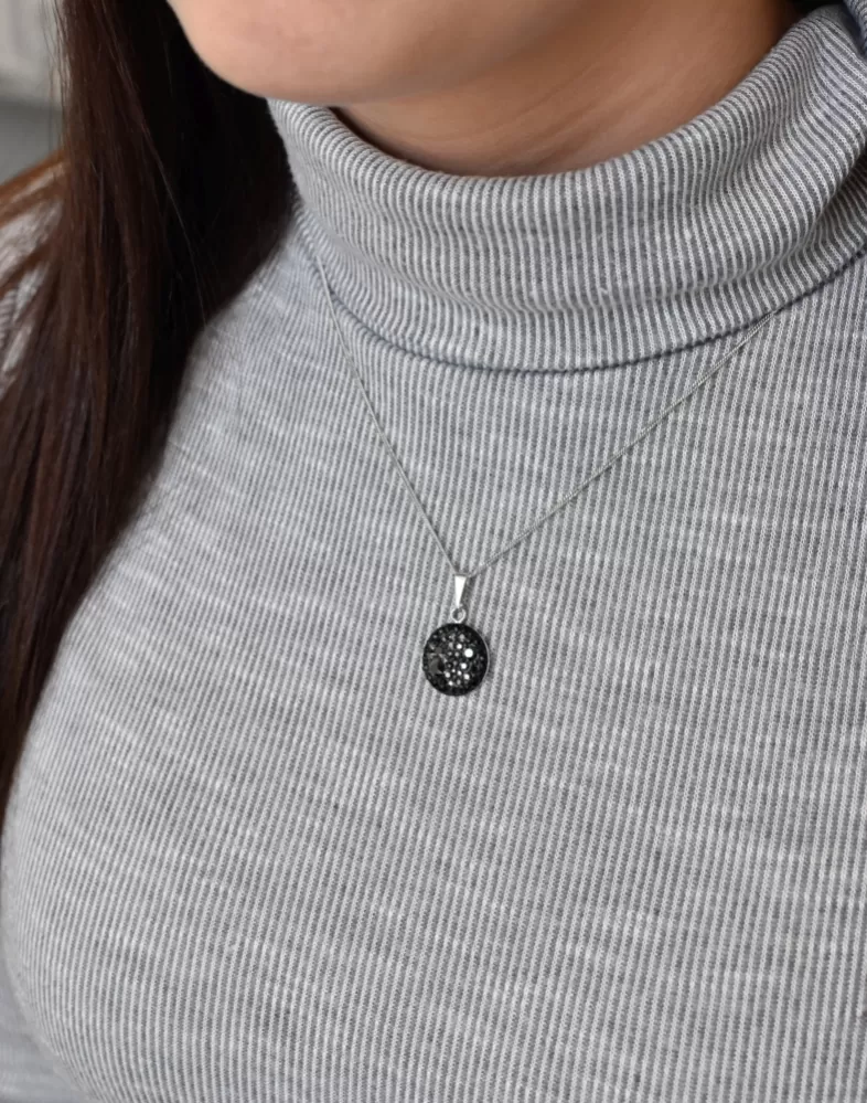 Strieborný okrúhly prívesok 34225.5 má priemer 14 mm a je zdobený niekoľkými malými okrúhlymi Swarovski kryštálmi v čiernej farbe. Na  prívesok bolo použité striebro o rýdzosti 925/1000, ktorého povrch prešiel úpravou ródiom. Ródium šperk ochráni proti sčerneniu, zožltnutiu alebo poškriabaniu. Prívesok neobsahuje nikel, a tak ho môžu bez obáv nosiť aj alergici.