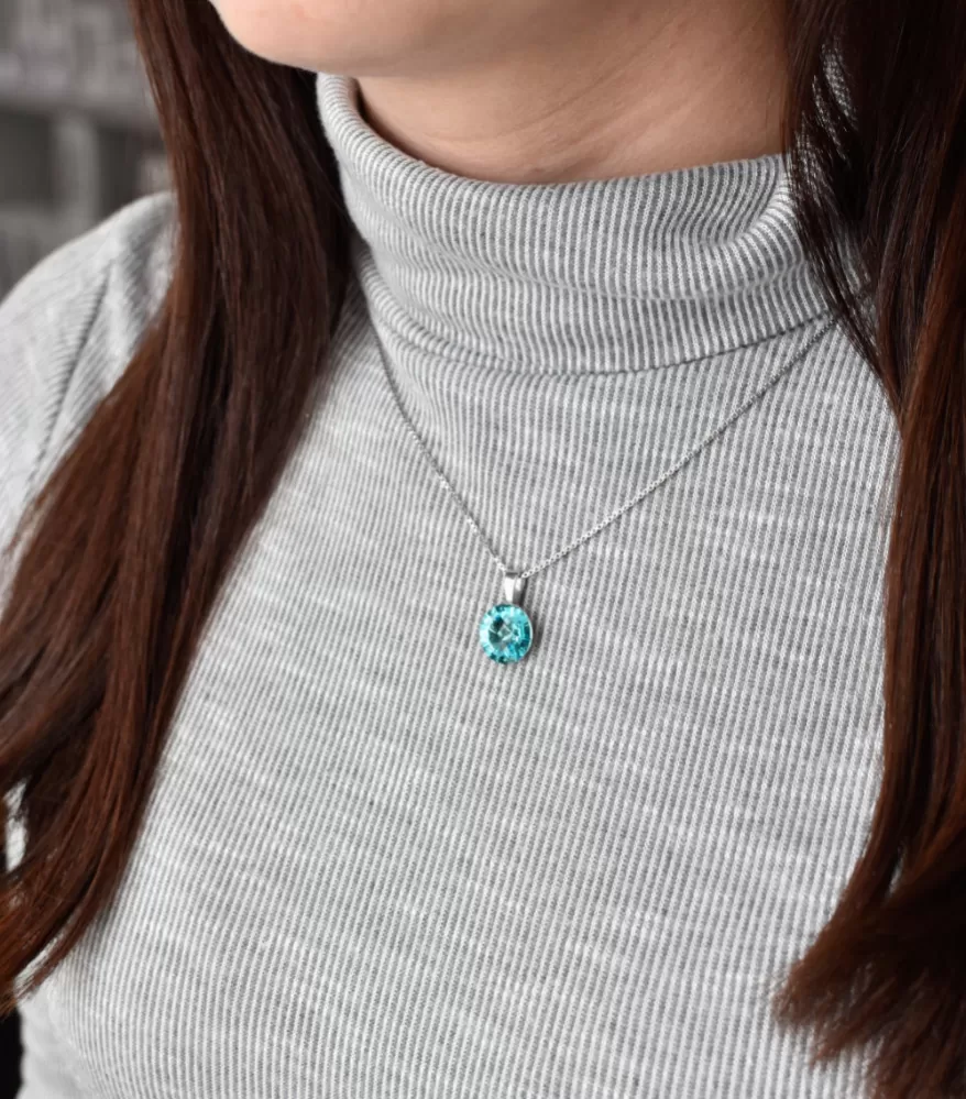 Tyrkysový Swarovski kryštál má priemer 12 mm. Na prívesok bolo použité striebro rýdzosti 925/1000, ktorého povrch prešiel úpravou ródiom. Ródium šperk ochráni proti sčerneniu, zožltnutiu alebo poškriabaniu.