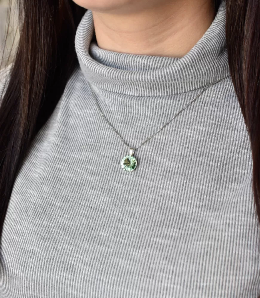 Zelený Swarovski kryštál má priemer 12 mm. Na prívesok bolo použité striebro rýdzosti 925/1000, ktorého povrch prešiel úpravou ródiom. Ródium šperk ochráni proti sčerneniu, zožltnutiu alebo poškriabaniu.