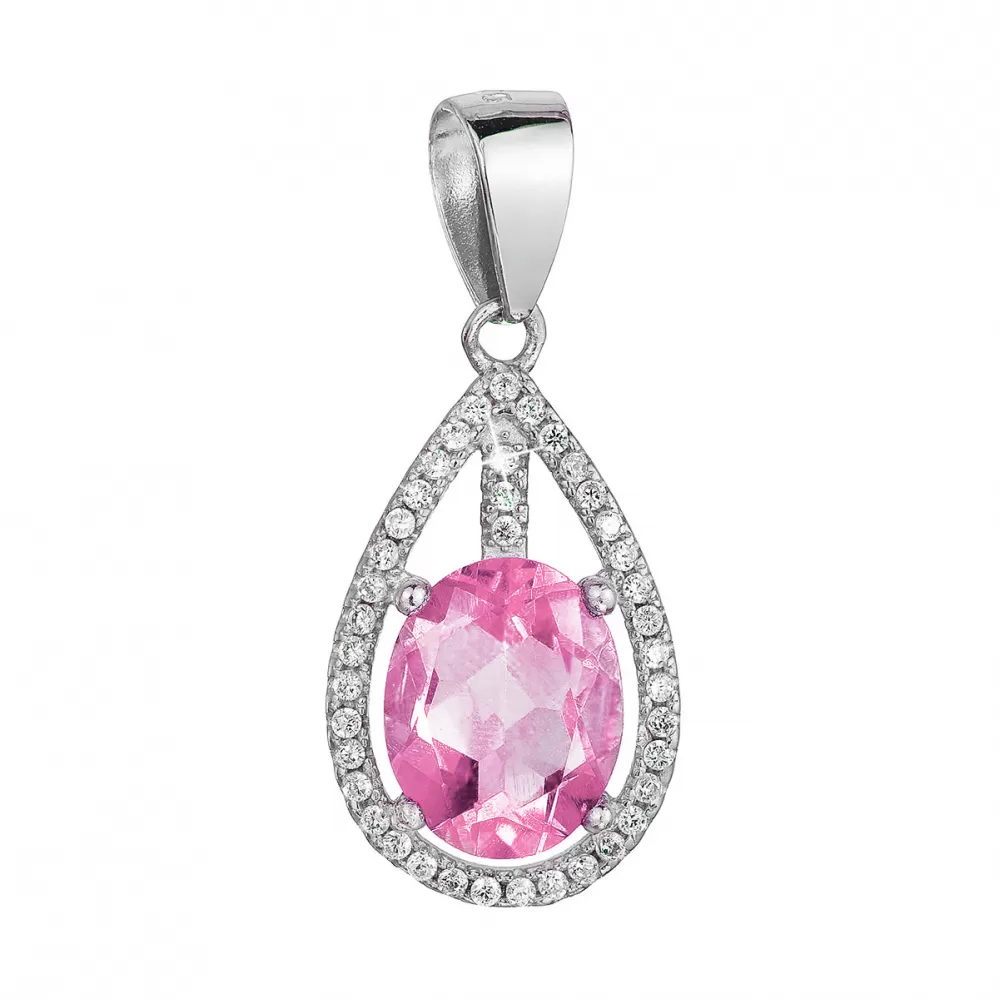 Strieborný bohato zdobený prívesok v tvare kvapky so zirkónmi bielej farby a výrazným ružovým zirkónom je vyrobený zo striebra s rýdzosťou 925/1000 vrátane povrchovej úpravy ródiom. Ródium ochráni šperk proti nechcenému sčernaniu, zožltnutiu i poškriabaniu.