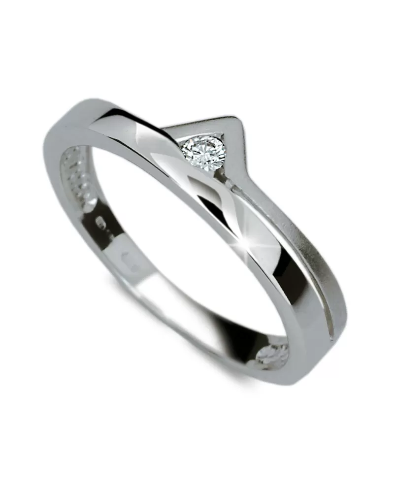 Dámsky prsteň s jedným bielym zirkónom je vyrobený z bieleho štrnástich karátového zlata 585/1000.  Prsteň je vyrobený v kombinácii lesklej a matnej povrchovej úprave.