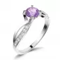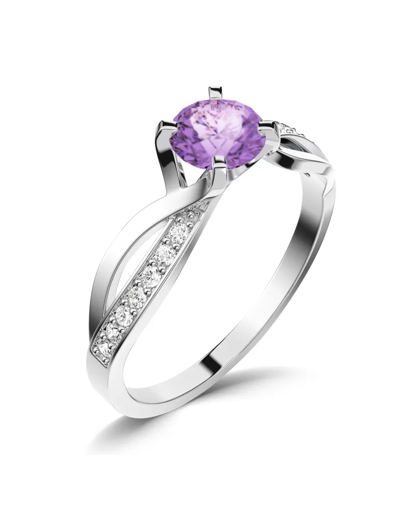Dámský prsten vyrobený z bílého čtrnácti karátového zlata - 585/1000 v lesklé povrchové úpravě. Prsten je tvořen hlavním kulatým Ametystem ve fialové barvě, ke kterému se vzpínají propletená ramena obroučky v kterých je vsazeno 14 ks menších diamantů vybroušených briliantovým brusem, který dodává vzniklým facetám maximální brilanci! Celý prsten působí dokonalým a luxusním dojmem!