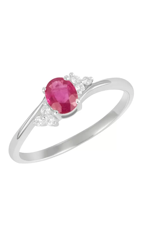 Krásny romantický prsteň vyrobený z bieleho štrnásťkarátového zlata - 585/1000 v lesklej povrchovej úprave. Prsteň je zdobený šiestimi žiarivými diamantmi briliantového brusu a jedným oválnym rubínom.