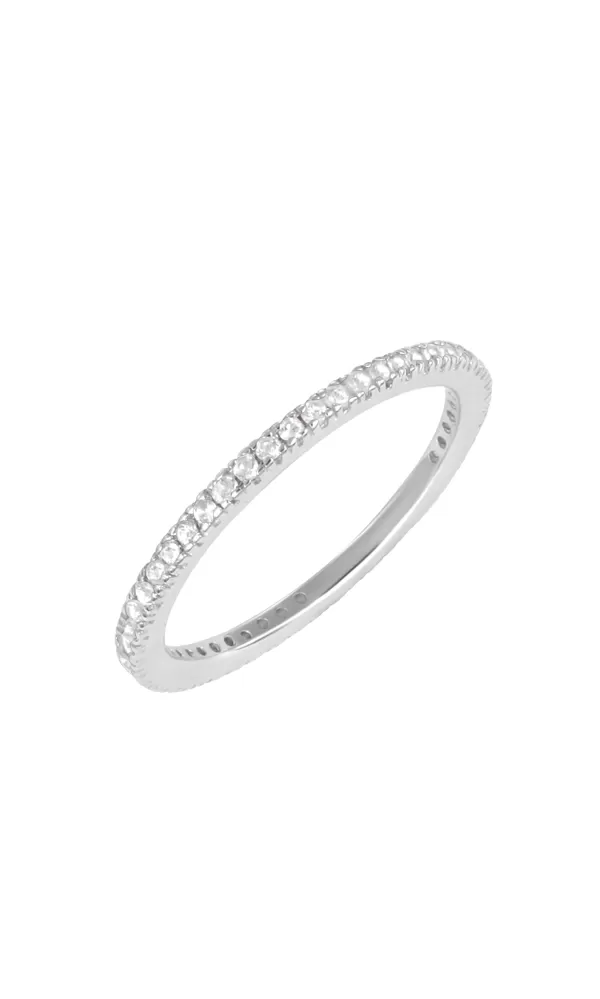 Exluzívny dámsky prsteň vyrobený z bieleho štrnásťkarátového zlata - 585/1000 v lesklej povrchovej úprave s okrúhlymi diamantmi briliantového brusu, ktoré sú osadené po celom obvode prsteňa.