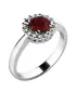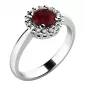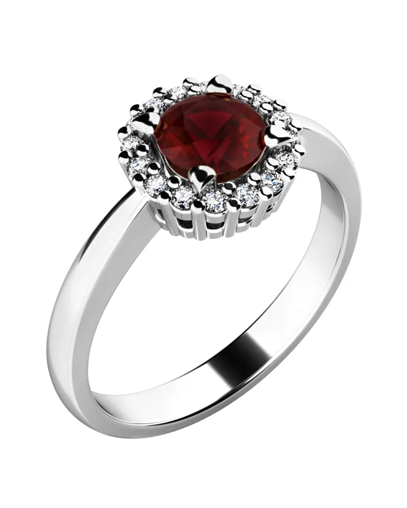 Dámský prsten vyrobený z bílého čtrnácti karátového zlata - 585/1000 v lesklé povrchové úpravě. Luxusní prsten je tvořen hlavním kulatým granátem v tmavé rudé barvy, kolem kterého je dokola osazeno 16 ks menších diamantů vybroušených briliantovým brusem, díky kterému dokonale odráží světlo a jejich brilance neuvěřitelné září z každého úhlu pohledu! Celý prsten působí dokonalým a luxusním dojmem!