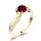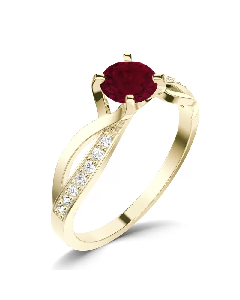 Dámský prsten vyrobený ze žlutého čtrnácti karátového zlata - 585/1000 v lesklé povrchové úpravě. Prsten je tvořen hlavním kulatým Granátem v červené barvě, ke kterému se vzpínají propletená ramena obroučky v kterých je vsazeno 14 ks menších diamantů vybroušených briliantovým brusem, který dodává vzniklým facetám maximální brilanci! Celý prsten působí dokonalým a luxusním dojmem! Je dokonale zpracovaný do nejmenších detailů a bude tak ideálním dárkem, který zaručeně potěší každou ženu či dívku.