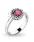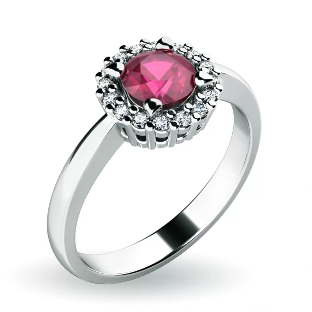Dámský prsten vyrobený z bílého čtrnácti karátového zlata - 585/1000 v lesklé povrchové úpravě. Luxusní prsten je tvořen hlavním kulatým rubínem v červené barvě, kolem kterého je dokola osazeno 16 ks menších diamantů vybroušených briliantovým brusem, díky kterému dokonale odráží světlo a jejich brilance neuvěřitelné září z každého úhlu pohledu! Celý prsten působí dokonalým a luxusním dojmem!