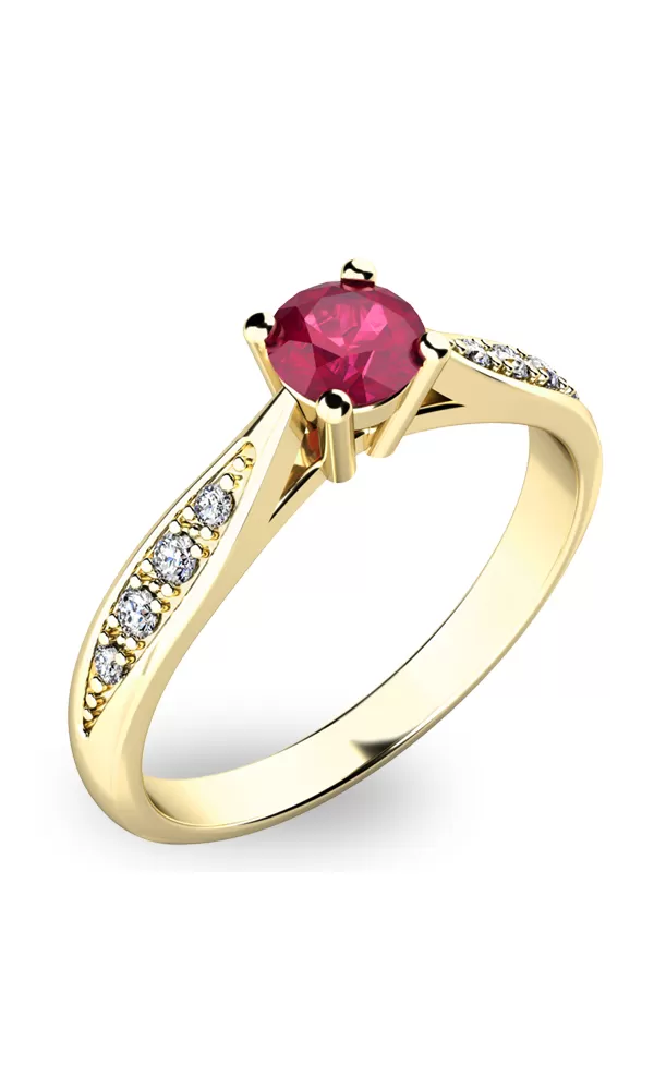 Krásny dámsky prsteň vyrobený zo žltého štrnástich karátových zlatých s čistotou 585/1000 pritiahne vaše okolie vďaka vloženému červenému rubínu. Okrem toho je prsteň zdobený 8 menšími diamantmi. Prsteň je veľmi elegantný a každá žena, ktorú mu darujete.