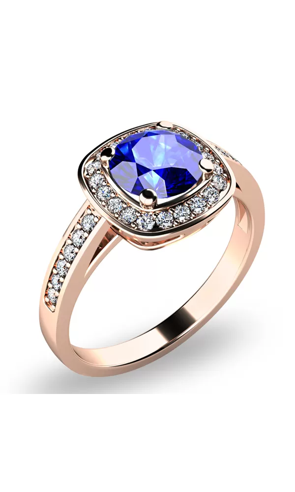 Dámský prsten vyrobený z růžového čtrnácti karátového zlata - 585/1000 v lesklé povrchové úpravě. Luxusní prsten je tvořen hlavním velkým tanzanitem v modré barvě, kolem kterého je dokola osazeno 20 ks menších diamantů a dalších 12 ks je vsazeno do obroučky. Celkem je v prstenu 32 ks diamantů vybroušených briliantovým brusem, díky kterému dokonale odráží světlo a jejich brilance neuvěřitelné září z každého úhlu pohledu! Celý prsten působí dokonalým a luxusním dojmem!