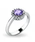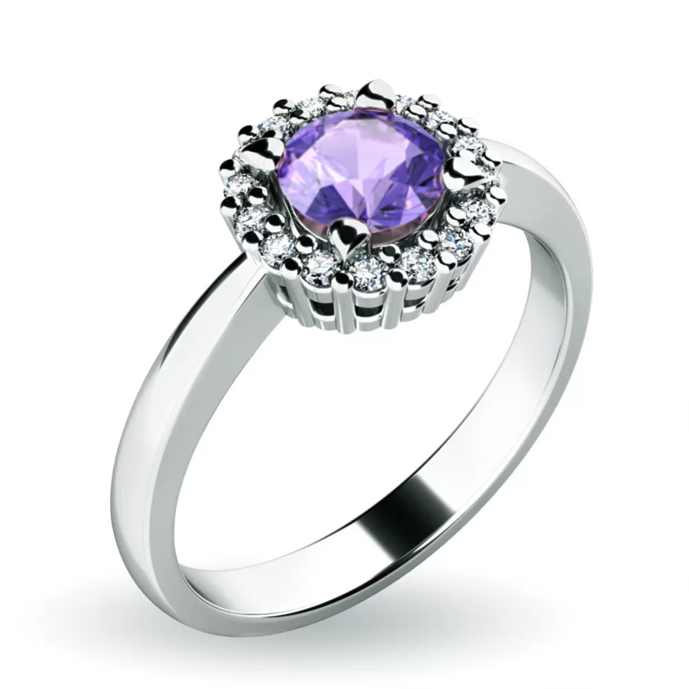Dámský prsten vyrobený z bílého čtrnácti karátového zlata - 585/1000 v lesklé povrchové úpravě. Luxusní prsten je tvořen hlavním kulatým tanzanitem v modrofialové barvě, kolem kterého je dokola osazeno 16 ks menších diamantů vybroušených briliantovým brusem, díky kterému dokonale odráží světlo a jejich brilance neuvěřitelné září z každého úhlu pohledu! Celý prsten působí dokonalým a luxusním dojmem!