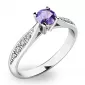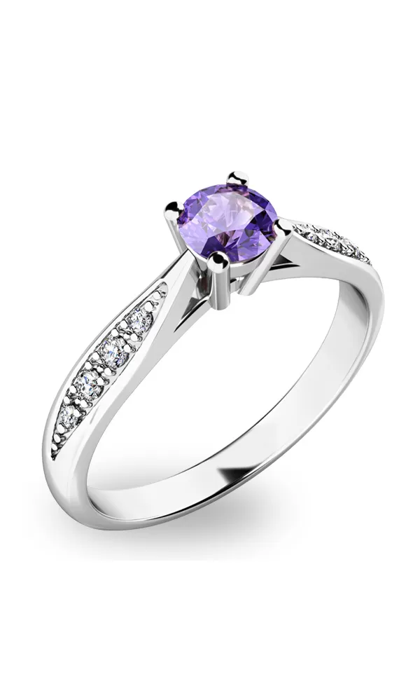 Krásny dámsky prsteň vyrobený z bieleho štrnástich karátových zlata s čistotou 585/1000 v lesklom povrchu sa vysadí 8 menších diamantov a jedným veľkým okrúhlym tanzanitom vo fialovej farbe. Prsteň je veľmi elegantný a každá žena, ktorú mu darujete.