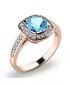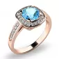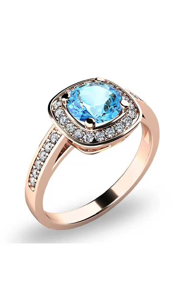 Dámský prsten vyrobený z růžového čtrnácti karátového zlata - 585/1000 v lesklé povrchové úpravě. Luxusní prsten je tvořen hlavním velkým topazem ve světle modré barvě, kolem kterého je dokola osazeno 20 ks menších diamantů a dalších 12 ks je vsazeno do obroučky. Celkem je v prstenu 32 ks diamantů vybroušených briliantovým brusem, díky kterému dokonale odráží světlo a jejich brilance neuvěřitelné září z každého úhlu pohledu! Celý prsten působí dokonalým a luxusním dojmem!