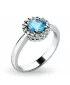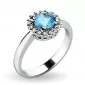 Dámský prsten vyrobený z bílého čtrnácti karátového zlata - 585/1000 v lesklé povrchové úpravě. Luxusní prsten je tvořen hlavním kulatým topazem ve světle modré barvě, kolem kterého je dokola osazeno 16 ks menších diamantů vybroušených briliantovým brusem, díky kterému dokonale odráží světlo a jejich brilance neuvěřitelné září z každého úhlu pohledu! Celý prsten působí dokonalým a luxusním dojmem!