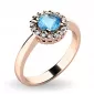 Dámský prsten vyrobený z růžového čtrnácti karátového zlata - 585/1000 v lesklé povrchové úpravě. Luxusní prsten je tvořen hlavním kulatým topazem ve světle modré barvě, kolem kterého je dokola osazeno 16 ks menších diamantů vybroušených briliantovým brusem, díky kterému dokonale odráží světlo a jejich brilance neuvěřitelné září z každého úhlu pohledu! Celý prsten působí dokonalým a luxusním dojmem!