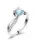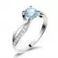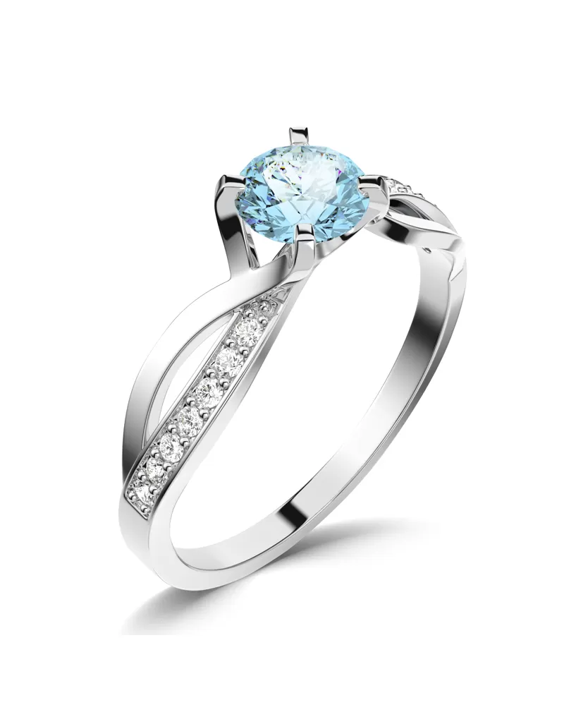 Dámský prsten vyrobený z bílého čtrnácti karátového zlata - 585/1000 v lesklé povrchové úpravě. Prsten je tvořen hlavním kulatým Topazem ve světle modré barvě, ke kterému se vzpínají propletená ramena obroučky v kterých je vsazeno 14 ks menších diamantů vybroušených briliantovým brusem, který dodává vzniklým facetám maximální brilanci! Celý prsten působí dokonalým a luxusním dojmem!