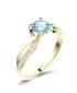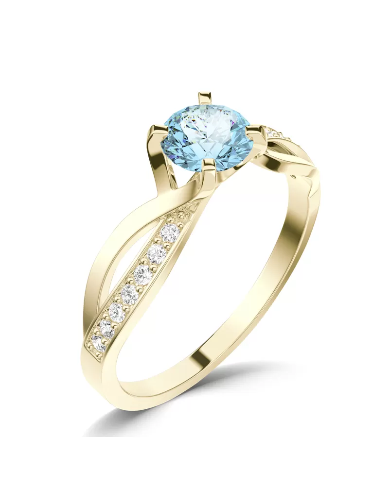 Dámský prsten vyrobený ze žlutého čtrnácti karátového zlata - 585/1000 v lesklé povrchové úpravě. Prsten je tvořen hlavním kulatým Topazem ve světle modré barvě, ke kterému se vzpínají propletená ramena obroučky v kterých je vsazeno 14 ks menších diamantů vybroušených briliantovým brusem, který dodává vzniklým facetám maximální brilanci! Celý prsten působí dokonalým a luxusním dojmem!