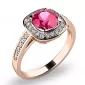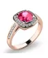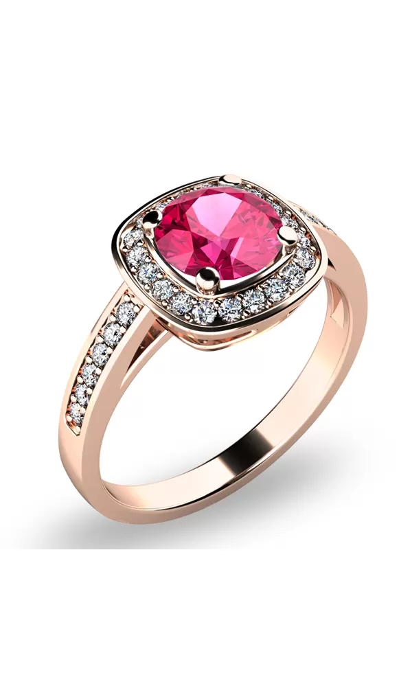 Dámský prsten vyrobený z růžového čtrnácti karátového zlata - 585/1000 v lesklé povrchové úpravě. Luxusní prsten je tvořen hlavním velkým turmalínem v růžovo červené barvě, kolem kterého je dokola osazeno 20 ks menších diamantů a dalších 12 ks je vsazeno do obroučky. Celkem je v prstenu 32 ks diamantů vybroušených briliantovým brusem, díky kterému dokonale odráží světlo a jejich brilance neuvěřitelné září z každého úhlu pohledu! Celý prsten působí dokonalým a luxusním dojmem!