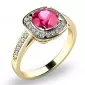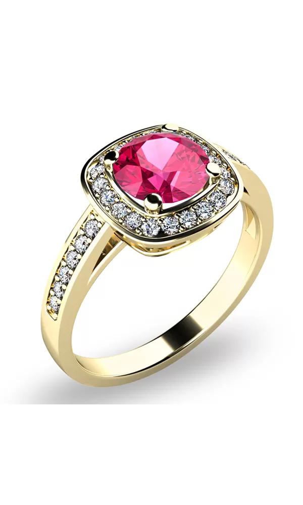 Dámský prsten vyrobený ze žlutého čtrnácti karátového zlata - 585/1000 v lesklé povrchové úpravě. Luxusní prsten je tvořen hlavním velkým turmalínem v růžovo červené barvě, kolem kterého je dokola osazeno 20 ks menších diamantů a dalších 12 ks je vsazeno do obroučky. Celkem je v prstenu 32 ks diamantů vybroušených briliantovým brusem, díky kterému dokonale odráží světlo a jejich brilance neuvěřitelné září z každého úhlu pohledu! Celý prsten působí dokonalým a luxusním dojmem!