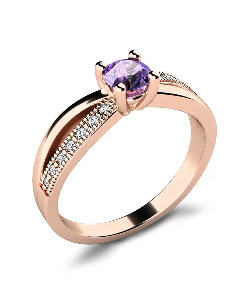 Elegantní prsten je vyroben z růžového čtrnáctikarátového zlata - 585/1000 v lesklé povrchové úpravě. Prstenu dominuje středový kulatý Tanzanit, který je uchycený do čtyřkrapnové korunky. Toto uchycení nechá Tanzanitu dokonale vyniknout v jeho kráse a brusu. Pro dokonalé zvýraznění prstenu je na každé straně v obroučce vsazeno sedm kulatých diamantů, které prsten zjemňují. Všechny diamanty mají briliantový brus, který zajišťuje maximální brilanci vybroušených facet, dokonale odráží světlo a diamanty krásně září z každého úhlu pohledu! Díky skladbě a stylově čistému vsazení kamenů, vyniká prsten krásnou brilancí všech kamenů. Vsazování diamantů do prstenů provádějí naši nejzkušenější mistři zlatníci ručně pod mikroskopem s přesností na 0,01mm a proto nehrozí vypadnutí kamínků jako to bývá u strojně vyráběných prstenů.