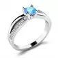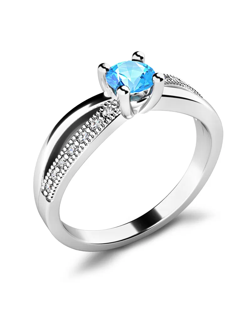 Elegantní prsten je vyroben z bílého čtrnáctikarátového zlata - 585/1000 v lesklé povrchové úpravě. Prstenu dominuje středový kulatý modrý topaz - Swiss blue, který je uchycený do čtyřkrapnové korunky. Toto uchycení nechá topazu dokonale vyniknout v jeho kráse a brusu. Pro dokonalé zvýraznění prstenu je na každé straně v obroučce vsazeno sedm kulatých diamantů, které prsten zjemňují. Všechny diamanty mají briliantový brus, který zajišťuje maximální brilanci vybroušených facet, dokonale odráží světlo a diamanty krásně září z každého úhlu pohledu! Díky skladbě a stylově čistému vsazení kamenů, vyniká prsten krásnou brilancí všech kamenů. Vsazování diamantů do prstenů provádějí naši nejzkušenější mistři zlatníci ručně pod mikroskopem s přesností na 0,01mm a proto nehrozí vypadnutí kamínků jako to bývá u strojně vyráběných prstenů.