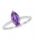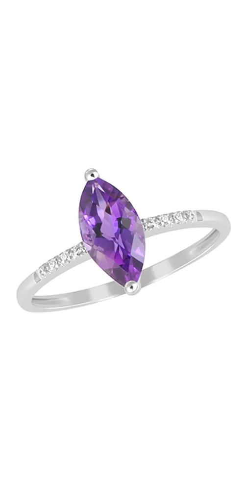 Luxusný dámsky prsteň je vyrobený z bieleho štrnásťkarátového zlata - 585/1000 v lesklej povrchovej úprave. Prsteň je zdobený ôsmimi žiarivými diamantmi briliantového brusu a jedným prírodným ametystom v tvare slzičky.