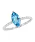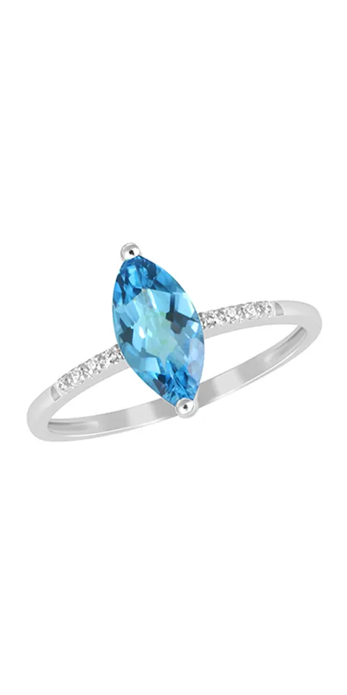 Luxusný dámsky prsteň je vyrobený z bieleho štrnásťkarátového zlata - 585/1000 v lesklej povrchovej úprave. Prsteň je zdobený ôsmimi žiarivými diamantmi briliantového brusu a jedným prírodným topazom v tvare slzičky.
