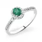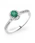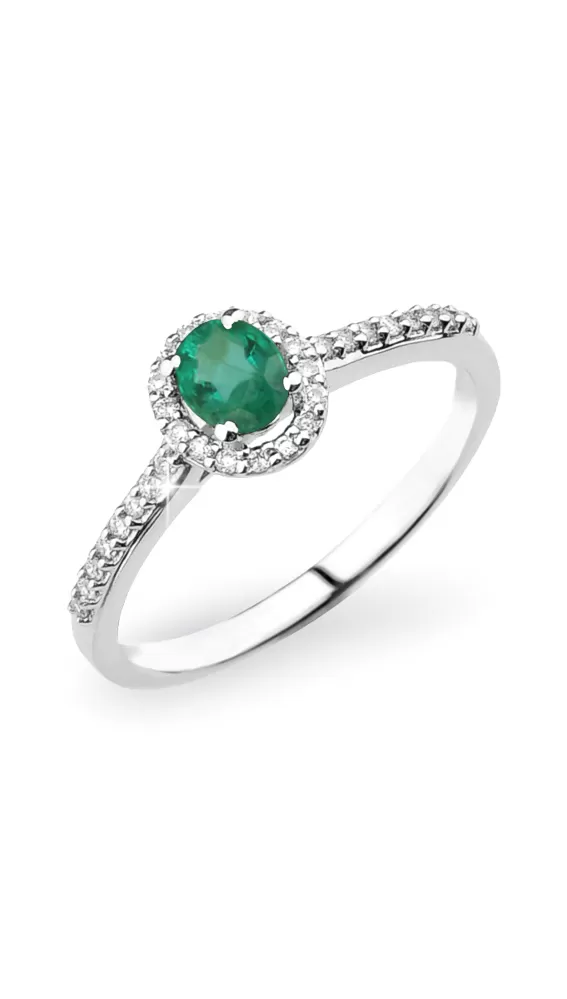 Elegantný dámsky prsteň vyrobený z bieleho štrnásťkarátového zlata - 585/1000 v lesklej povrchovej úprave. Prsteň je zdobený tridsaťdvami žiarivými diamantmi briliantového brusu a jedným oválnym zeleným smaragdom. Diamanty sú vybrúsené briliantovým brusom, ktorý zaisťuje maximálnu brilanciu vybrúsených facet, dokonale odráža svetlo a neuveriteľne žiari z každého uhla pohľadu! Vďaka skladbe a štýlovo čistému vsadeniu diamantov, prsteň vyniká krásnou brilanciou kameňov. Celý prsteň pôsobí dokonalým a luxusným dojmom!