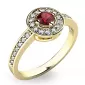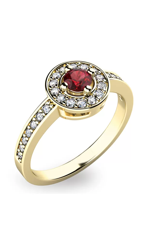Dámsky prsteň vyrobený zo žltého štrnástich karátového zlata - 585/1000 v lesklej povrchovej úprave. Luxusný prsteň je tvorený hlavným českým granátom v hnedo-červenej farbe uprostred, okolo ktorého sú dookola menšie diamanty. Obrúčka prsteňa je do polovice tiež vysadená malými diamantmi. Celý prsteň pôsobí dokonalým dojmom!