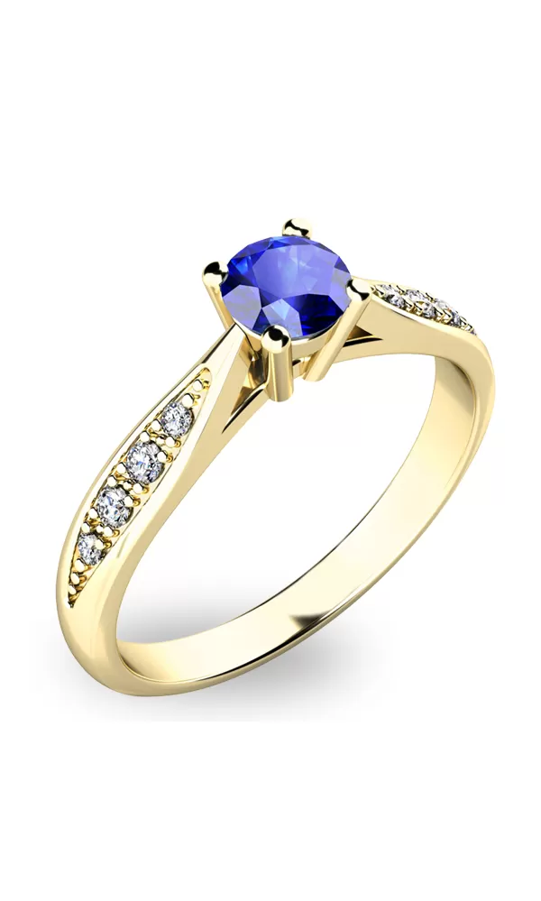 Krásny dámsky prsteň vyrobený zo žltého štrnástich karátových zlatých s čistotou 585/1000 pritiahne vaše okolie vďaka nastaveniu Royal Blue Natural Sapphire z Madagaskaru. Okrem toho je prsteň zdobený 8 menšími diamantmi. Prsteň je veľmi elegantný a každá žena, ktorú mu darujete.