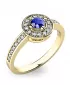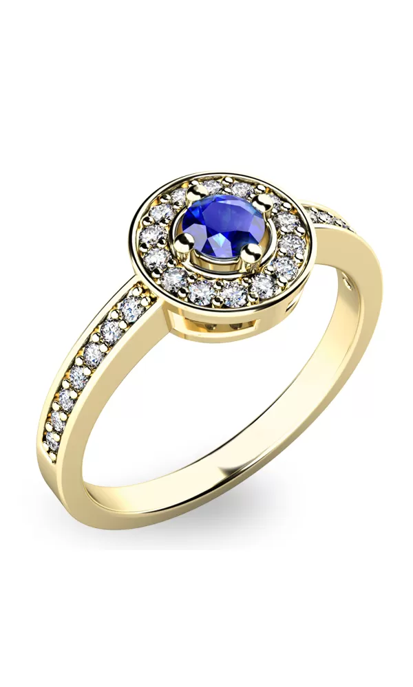 Dámsky prsteň vyrobený zo žltej štrnástich karátových zlatých - 585/1000 v lesklom povrchu. Luxus Prsteň je tvorený hlavným veľkým zafírom v kráľovskej modrej farbe v strede, okolo ktorého sú menšie diamanty. Prsteň krúžku je tiež napoly vyrovnaný malými diamantmi. Celý prsteň poskytuje dokonalý dojem!
