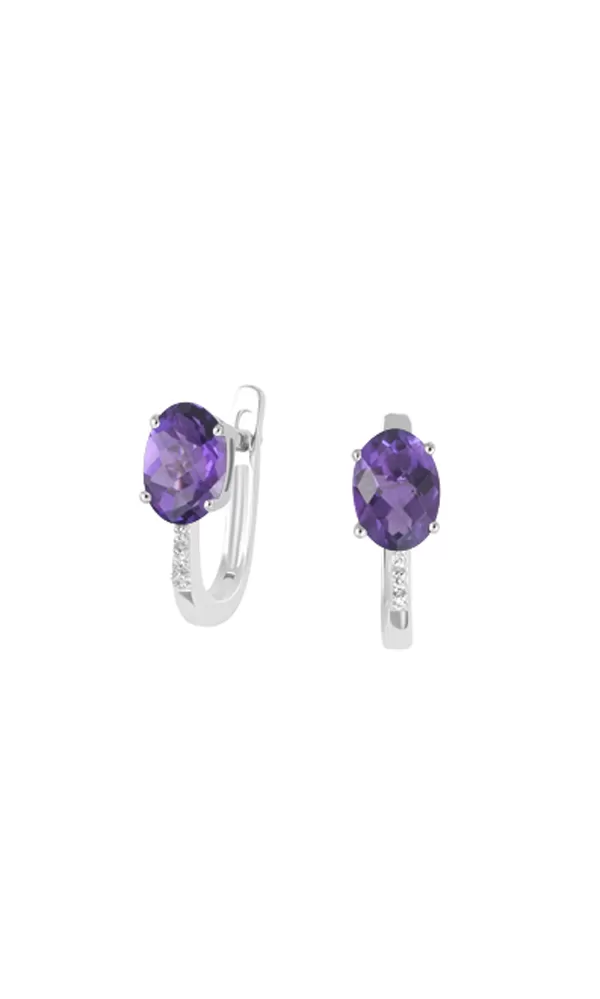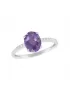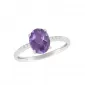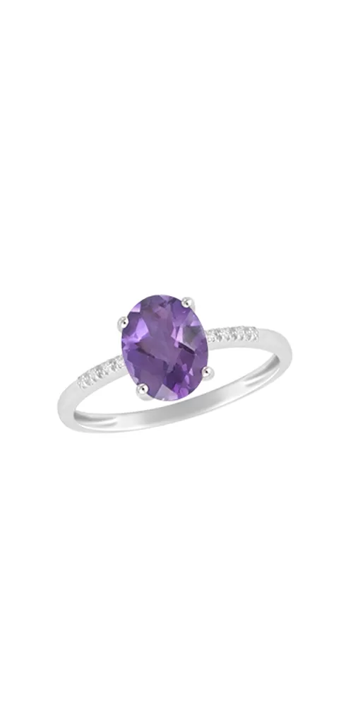 Tento úžasný dámsky prsteň je vyrobený z bieleho štrnásťkarátového zlata - 585/1000 v lesklej povrchovej úprave. Prsteň je zdobený ôsmimi žiarivými diamantmi briliantového brusu a jedným prírodným ametystom oválneho tvaru.